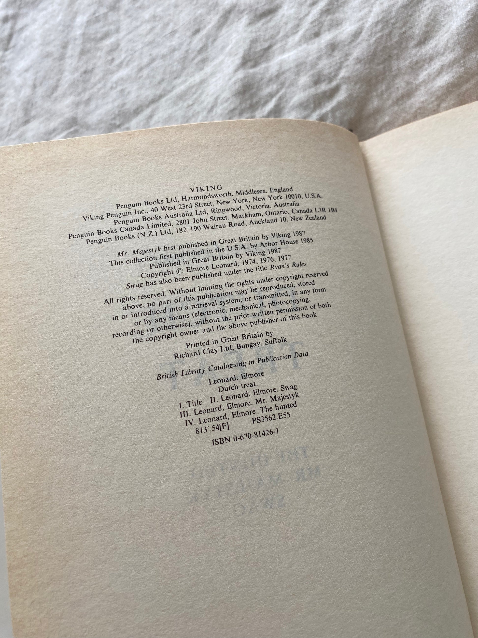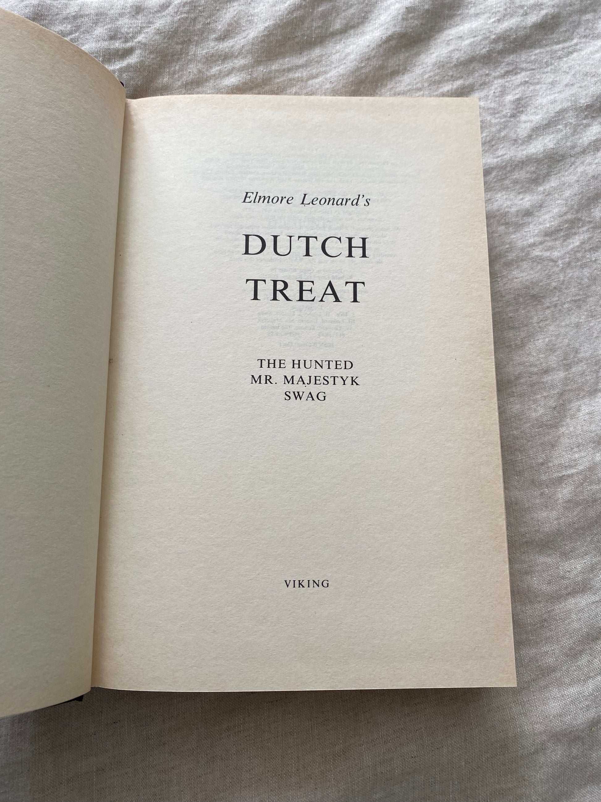 Description:This first edition, first printing UK hardback of Dutch Treat is an omnibus volume collecting three of Elmore Leonard’s most iconic crime novels: Swag, Mr. Majestyk, and The Hunted. Showcasing Leonard’s legendary talent for sharp dialogue, hardboiled storytelling, and morally tangled plots, the collection spans high-tension heists, revenge-driven vigilante justice, and deadly cross-border pursuits. Published by Viking in 1987, this edition brings together some of Leonard’s best mid-career work in a single, stylishly bound volume - ideal for collectors of classic American noir and crime fiction.