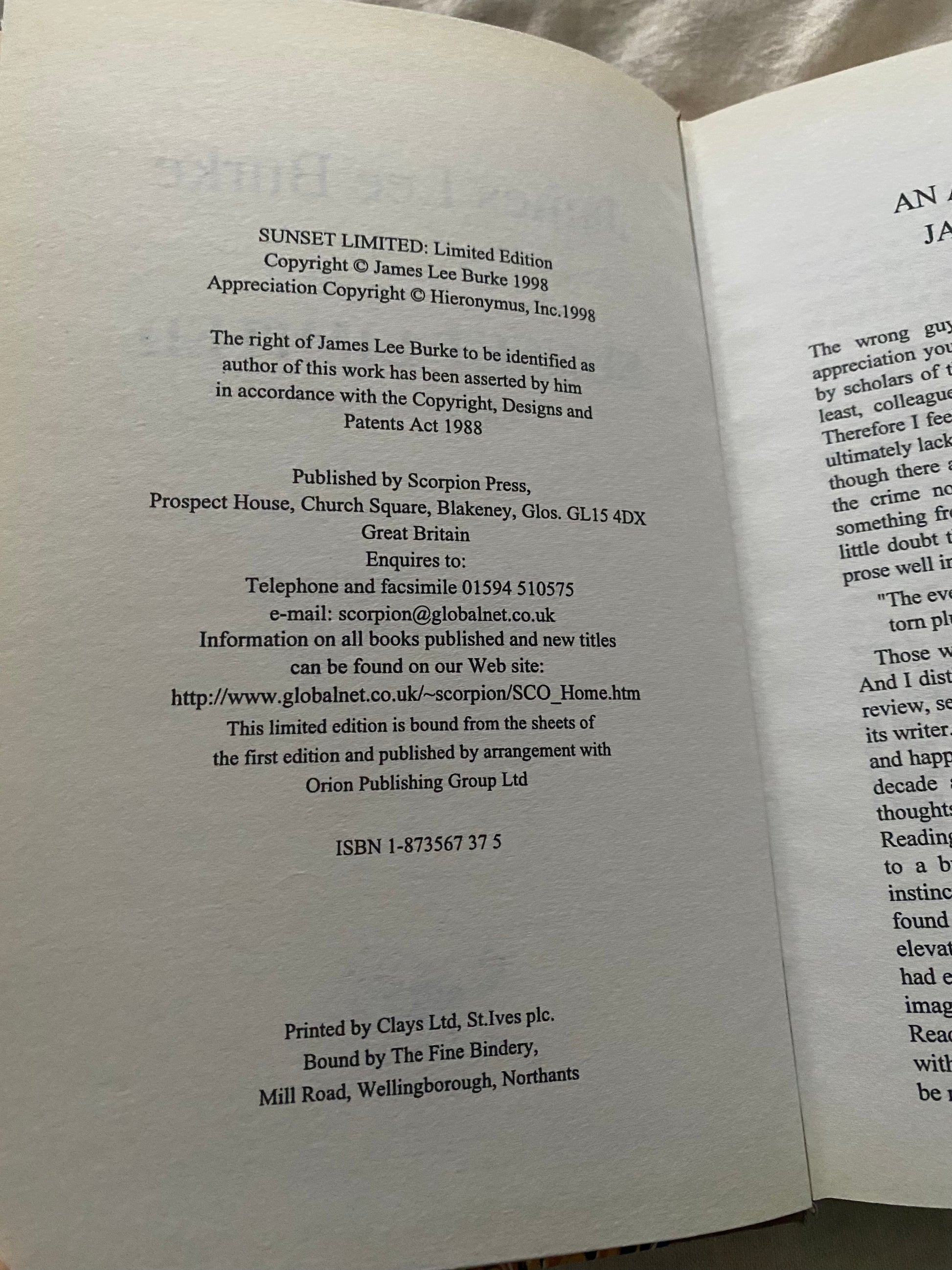 Description:This exceptional signed, numbered hardback of Sunset Limited is part of a highly limited run of just 110 copies produced by Scorpion Press, renowned for their handcrafted collector editions. Numbered 108/110, this copy is signed by James Lee Burke and presented in a protective cover. The novel follows Louisiana detective Dave Robicheaux as he becomes entangled in a case involving a murdered civil rights activist, uncovering secrets that span decades of history, violence and betrayal. This premium edition is highly sought after by collectors of modern crime literature and represents one of Burke’s most atmospheric works in a deluxe format.